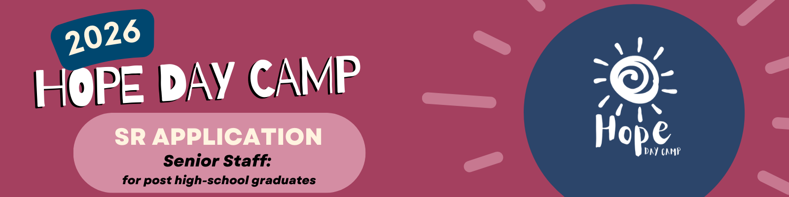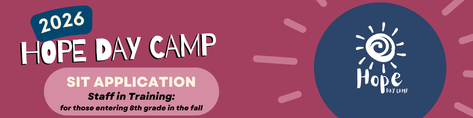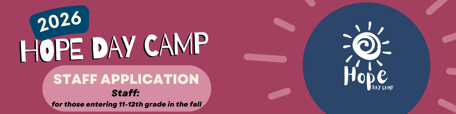 Apply online by April 15. For more information contact us: Name Email Address Message 7 + 8 = Submit Hope Day Camp is a faith-based day camp that welcomes campers and staff from all backgrounds and beliefs! Apply Here: SIT Apply Here: JR Staff Apply Here: Staff Apply Here: SR Staff Apply Here: Camp Nurse